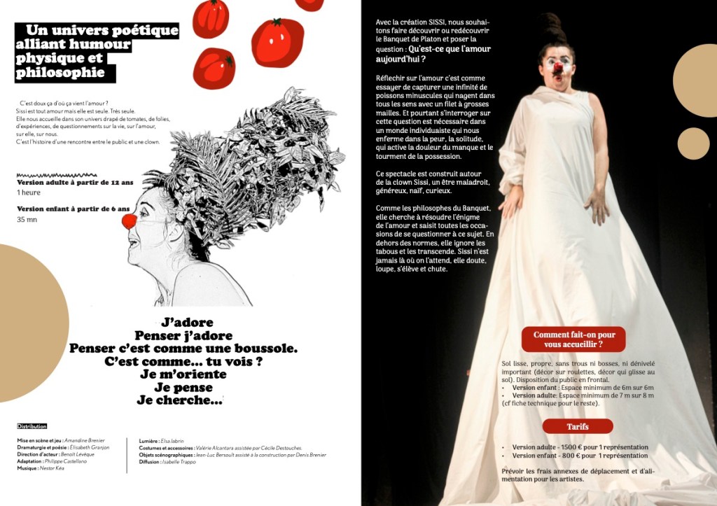 « C’est doux ça d’où ça vient l’amour ? » Sissi nous accueille dans son univers drapé de tomates, de folies, d’expériences, de questionnements sur la vie, sur l’amour, sur elle, sur nous. Les pensées se bousculent dans sa tête au point que, comme elle, on pourrait parfois s’y perdre. Pourtant, au beau milieu des acrobaties, pirouettes et révélations poétiques, la réflexion ne cesse de s’enrichir. Le spectateur, invité au banquet, chemine à travers la philosophie. Une définition de l’amour peut-elle émerger ?